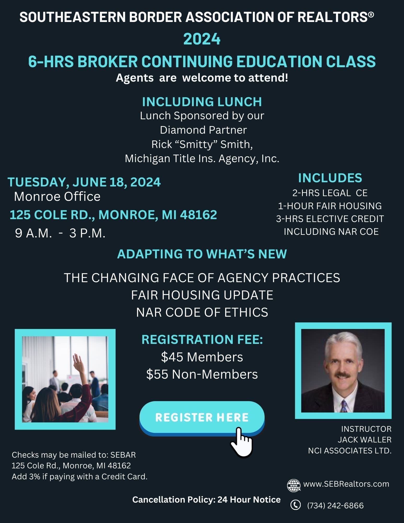 2024 Broker CE Class! Agents are welcome to register! 6-HRS In-Person Class. 3-HRS Legal, 3-HRS Elective CE, Including COE & Fair Housing with Jack Waller - SEBAR Monroe Office