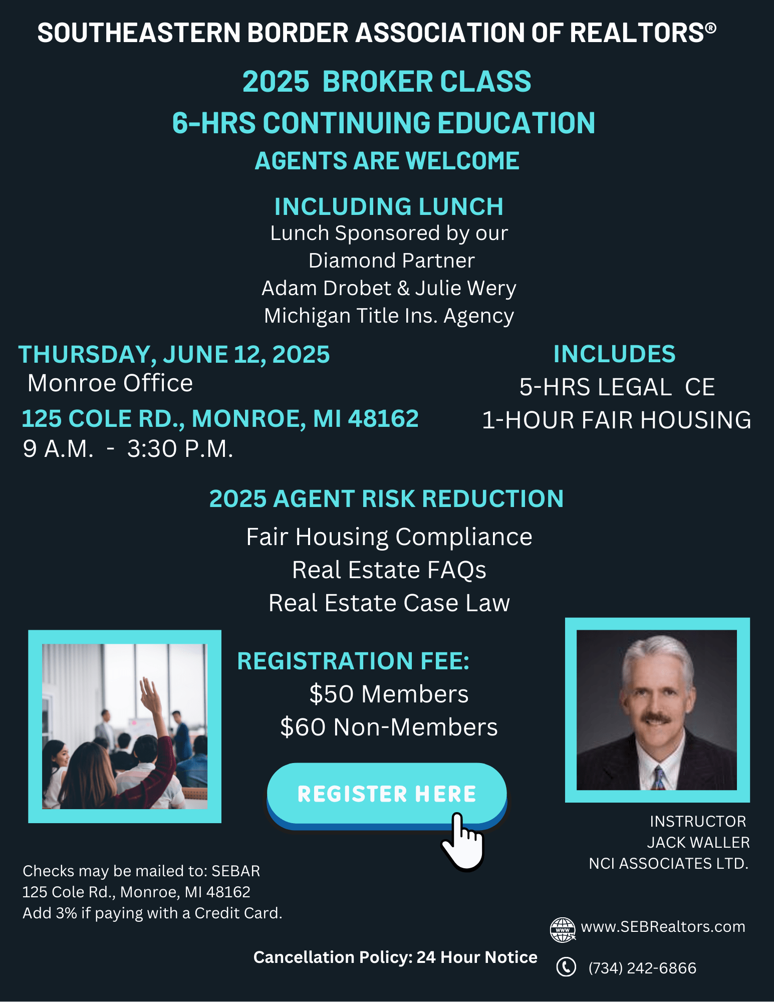 Jack Waller - 6 Hours In-person Con-Ed including Fair Housing, 9:00 AM - 3:00 PM at the SEBAR Monroe office. Lunch included!