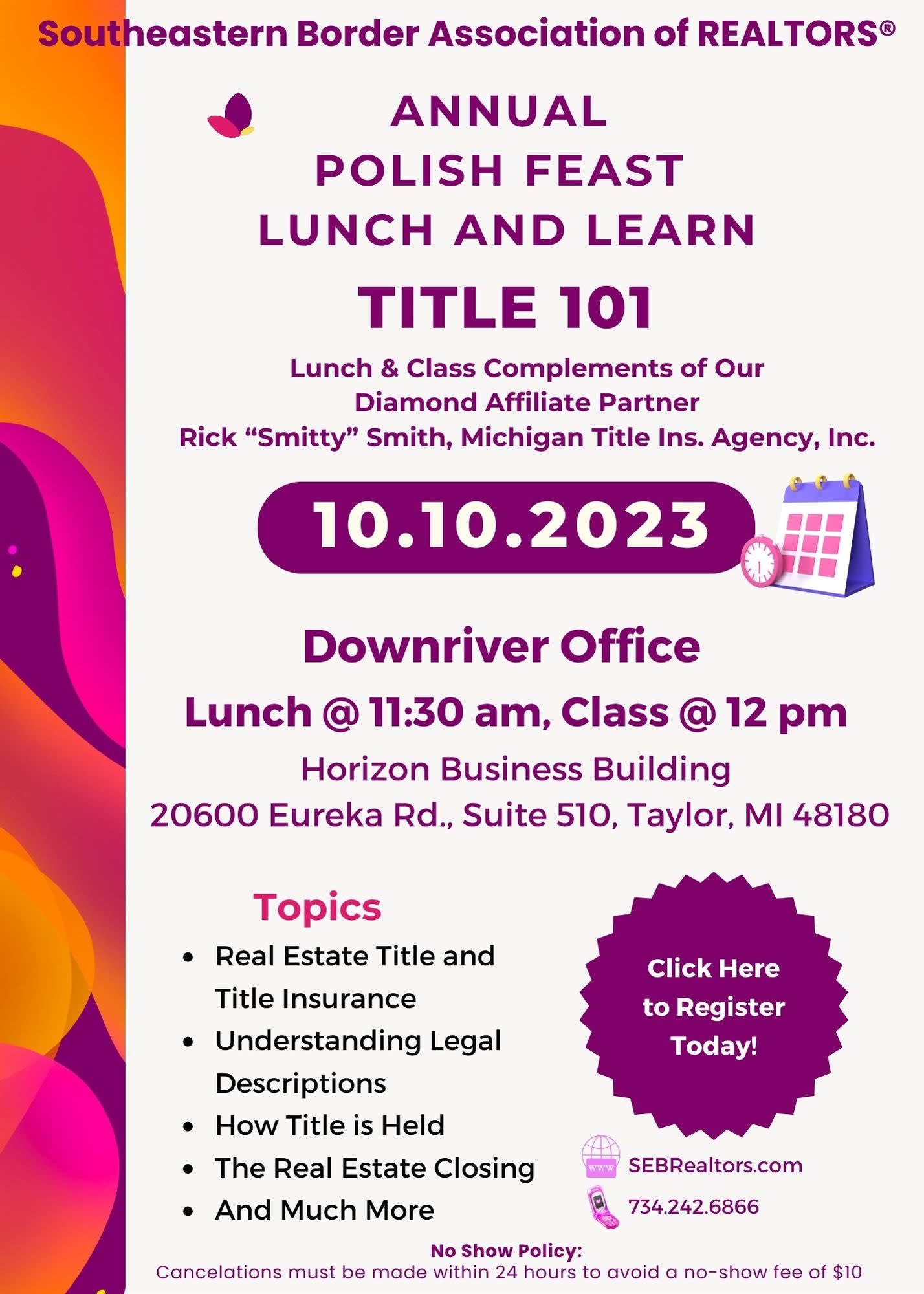 Polish lunch served at 11:30 a.m., Title 101 class starts at 12 Noon - 1:00 p.m.