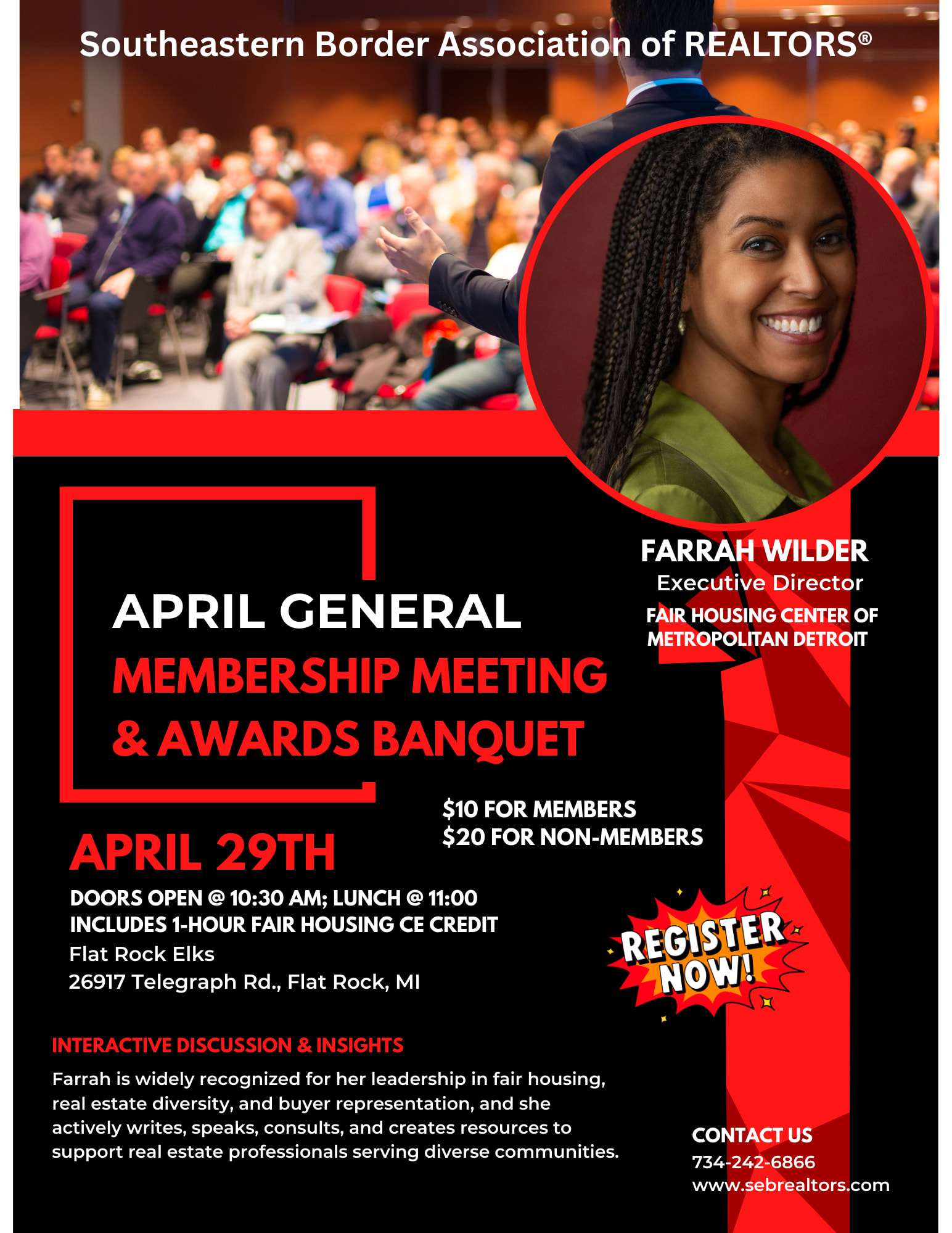 The Southeastern Border Association of REALTORS welcome speaker Farrah Wilder, Executive Director, Fair Housing Center of Metropolitan Detroit to our 2026 Fair Housing General Membership Meeting Awards banquet on Tuesday, April 29th at the Flat Rock Elk Lodge. Includes lunch,1 Hour Fair Housing CE. Awards ceremony to follow. $10 SEBAR Members and $20 Non-Members. Register Today!