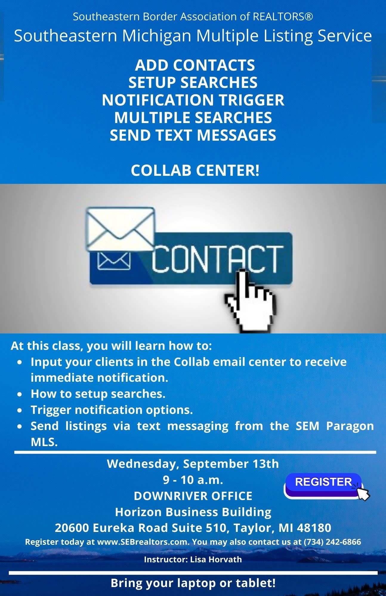 Downriver Office from 9 - 10 AM, Wednesday, September 13th.
