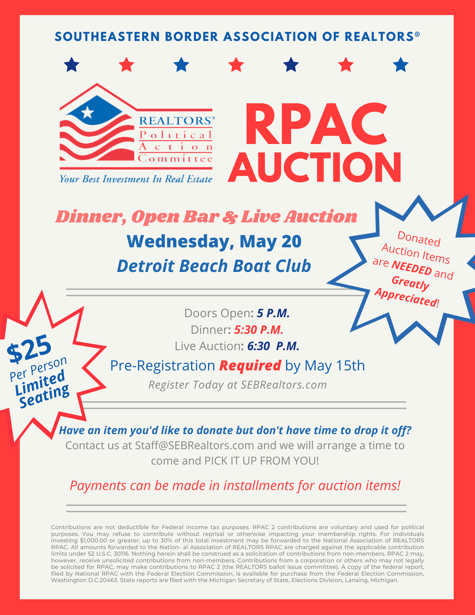 $25/person Dinner, Open Bar & Live Auction. Pre-Registration Required. Donated Auction Items are NEEDED and Greatly Appreciated! Wednesday, May 20th Detroit Beach Boat Club. Doors open at 5 p.m.