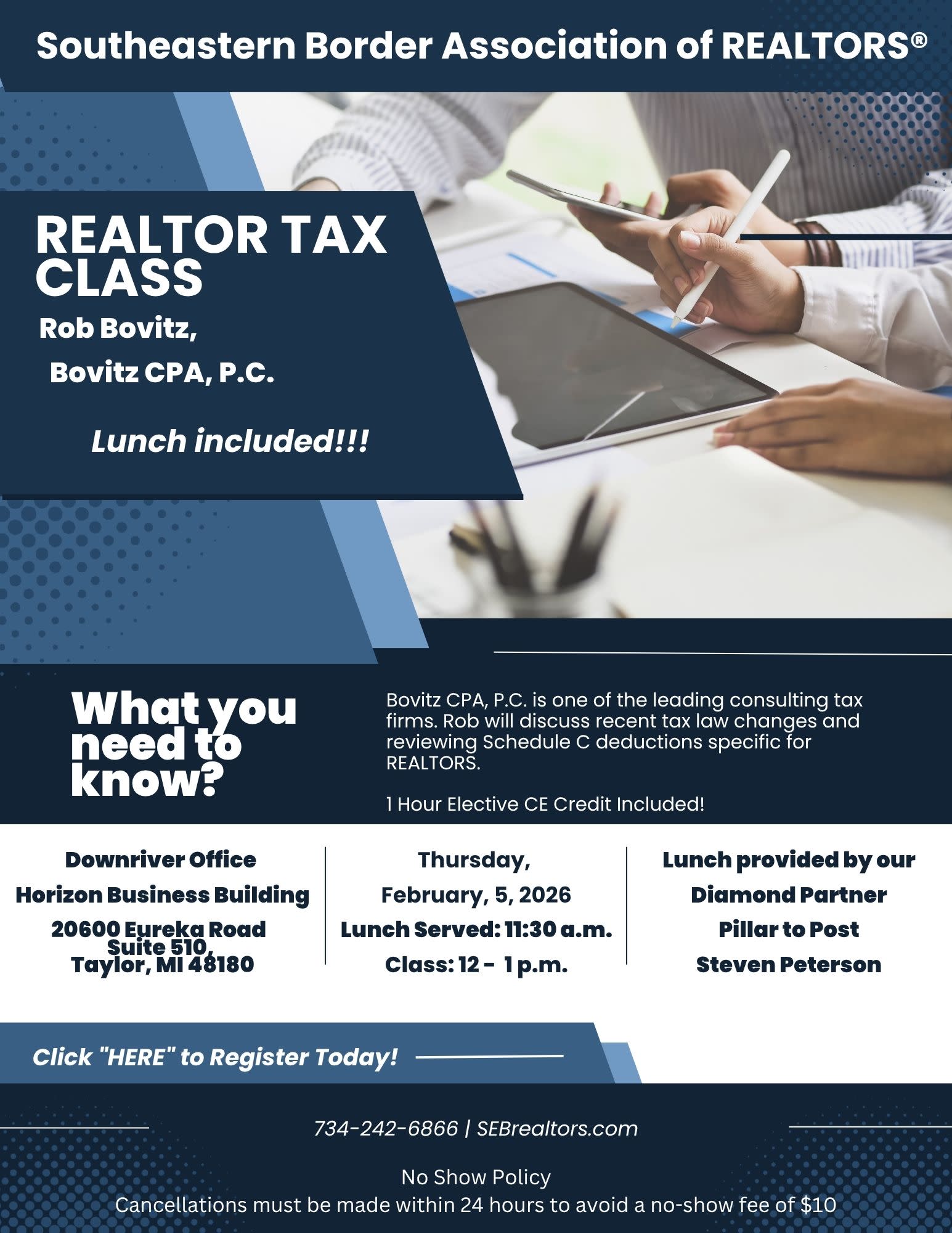Rob Bovitz is one of the leading consulting tax firms. Rob will discuss recent tax law changes and reviewing deductions specific for REALTORS! Class includes lunch starting at 11:30 a.m. and 1-HR elective CE Credit. Space is limited! Register Today!