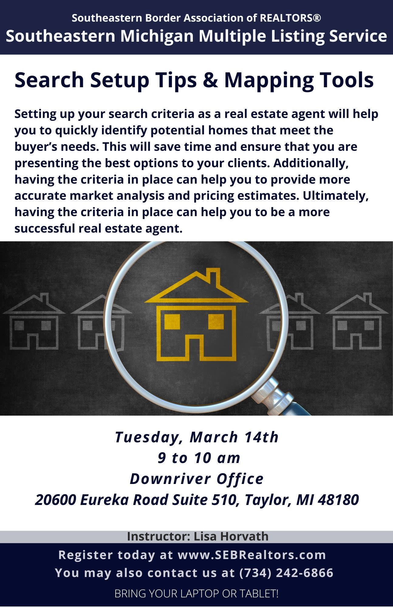 Search Setup Tips & Mapping Tools will be held on Tuesday, March 14th from 9 a.m. - 10 a.m. at the Downriver Office. 20600 Eureka Road, Suite 510 Taylor, MI 48180