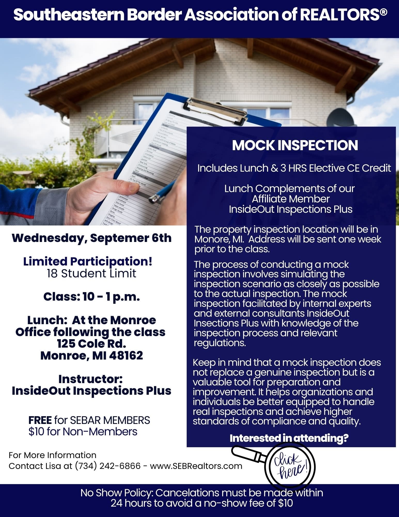 The property inspection location will be in Monroe, MI. Address will be sent one week prior to the class. The process of conducting a mock inspection involves simulating the inspection scenario as closely as possible to the actual inspection. The mock inspection facilitated by internal experts and external consultants InsideOut Insections Plus with knowledge of the inspection process and relevant regulations. Keep in mind that a mock inspection does not replace a genuine inspection but is a valuable tool for preparation and improvement. It helps organizations and individuals be better equipped to handle real inspections and achieve higher standards of compliance and quality. Includes 3 Hours Elective CE Credit!Images